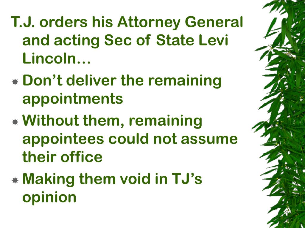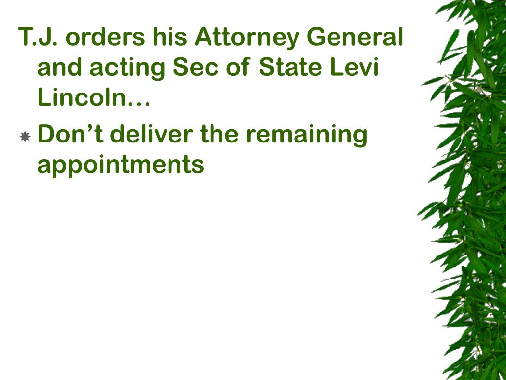 T.J. orders his Attorney General and acting Sec of State Levi Lincoln… • Don’t deliver the remaining appointments • Without them, remaining appointees could not assume their office • Making them void in TJ’s opinion