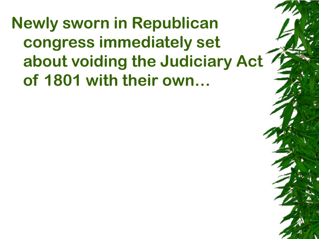 Newly sworn in Republican congress immediately set about voiding the Judiciary Act of 1801 with their own… Judiciary Act of 1802 • The Judicial Branch would operate under the dictates of the original Jud. Act of 1789