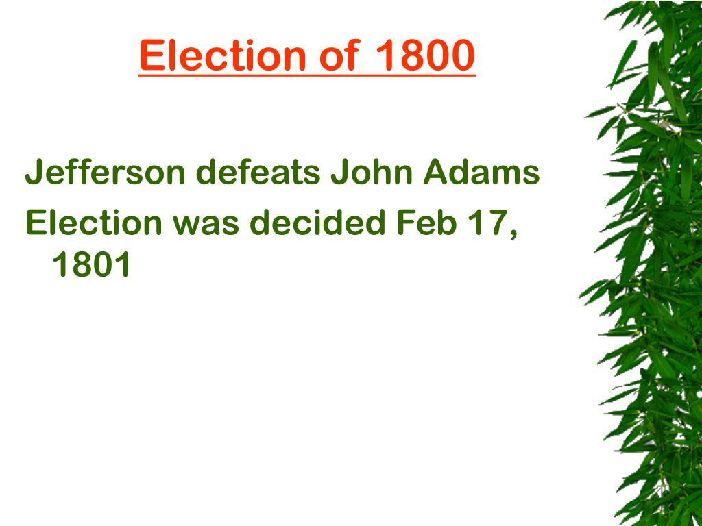 Election of 1800 Jefferson defeats John Adams Election was decided Feb 17, 1801