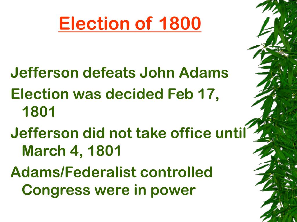 Election of 1800 Jefferson defeats John Adams Election was decided Feb 17, 1801 Jefferson did not take office until March 4, 1801 Adams/Federalist controlled Congress were in power