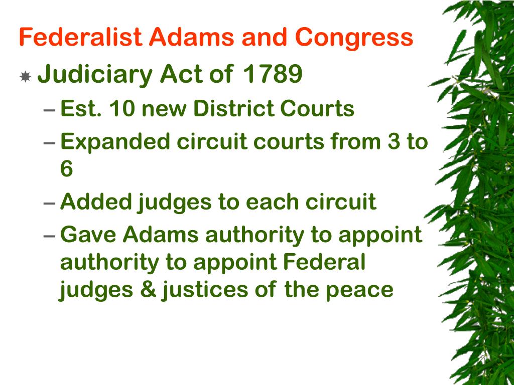 Federalist Adams and Congress • Judiciary Act of 1789 • Est. 10 new District Courts • Expanded circuit courts from 3 to 6 • Added judges to each circuit • Gave Adams authority to appoint authority to appoint Federal judges & justices of the peace