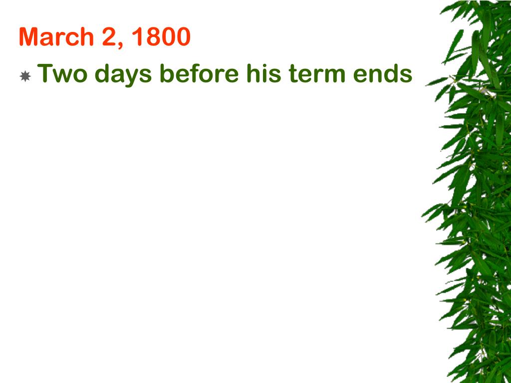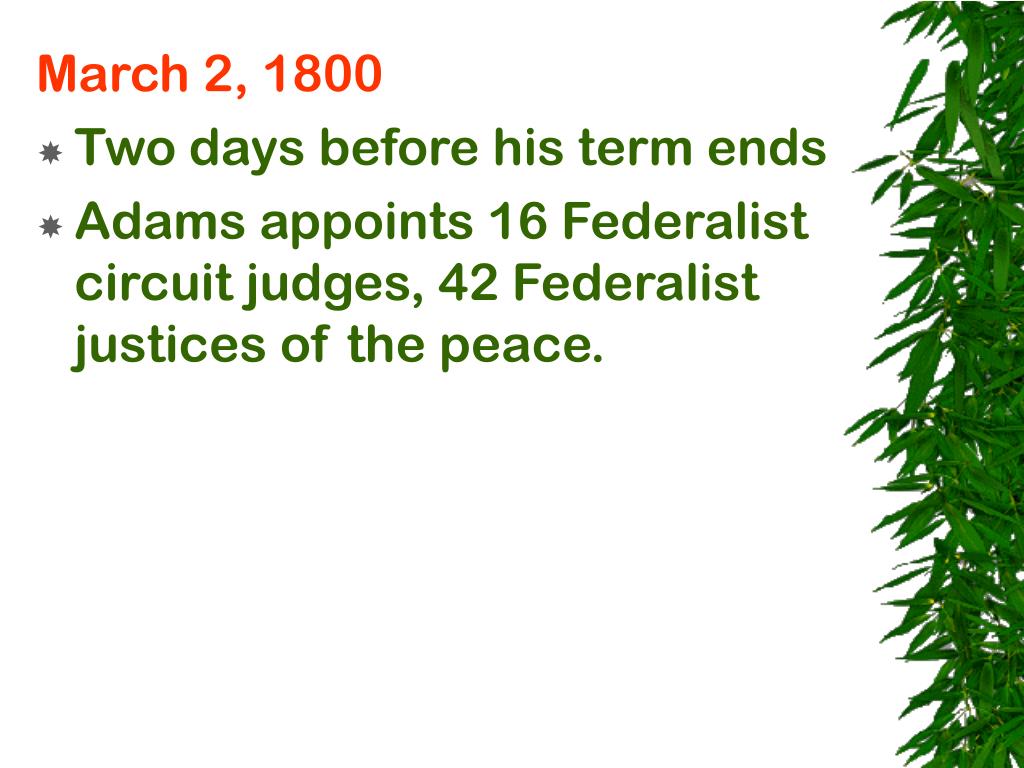 March 2, 1800 • Two days before his term ends • Adams appoints 16 Federalist circuit judges, 42 Federalist justices of the peace.