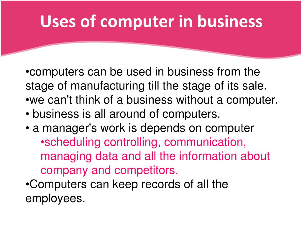 Uses of computer in business • computers can be used in business from the stage of manufacturing till the stage of its sale. • we can't think of a business without a computer. • business is all around of computers. • a manager's work is depends on computer • scheduling controlling, communication, managing data and all the information about company and competitors. • Computers can keep records of all the employees.