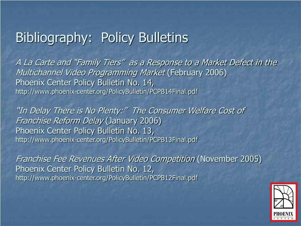Bibliography: Policy BulletinsA La Carte and “Family Tiers” as a Response to a Market Defect in the Multichannel Video Programming Market (February 2006)Phoenix Center Policy Bulletin No. 14, http://www.phoenix-center.org/PolicyBulletin/PCPB14Final.pdf “In Delay There is No Plenty:” The Consumer Welfare Cost of Franchise Reform Delay (January 2006)Phoenix Center Policy Bulletin No. 13,http://www.phoenix-center.org/PolicyBulletin/PCPB13Final.pdf Franchise Fee Revenues After Video Competition (November 2005)Phoenix Center Policy Bulletin No. 12, http://www.phoenix-center.org/PolicyBulletin/PCPB12Final.pdf