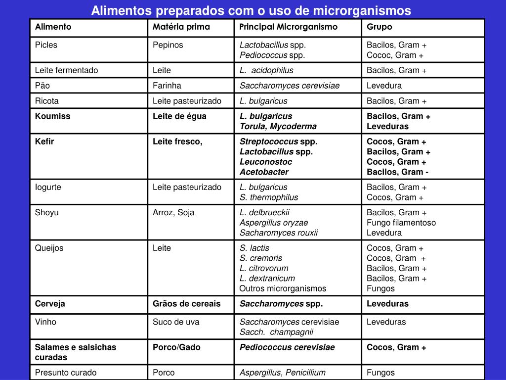 LevedurasSaccharomyces cerevisiaeS. florentinusS. pretoriensisCandida validaC. lambicaKloeckera apiculataHansenula yalbensis Streptococci/LactococciStreptococcus cremorisStr. faecalisStr. lactisLeuconostoc mesenteroidesPediococcus damnosus LactobacilliLactobacillus alactosusL. brevisL. casei subsp. caseiL. casei subsp. pseudoplantarumL. casei subsp. rhamnosusL. casei subsp. toleransL. coryneformis subsp. torquensL. fructosusL. hilgardiiL. homohiochiL. plantarumL. pseudoplantarumL. yamanashiensis Kefir: alimento à base de leite preparado por microrganismos - Originário do Cáucaso, “um presente de Alá”