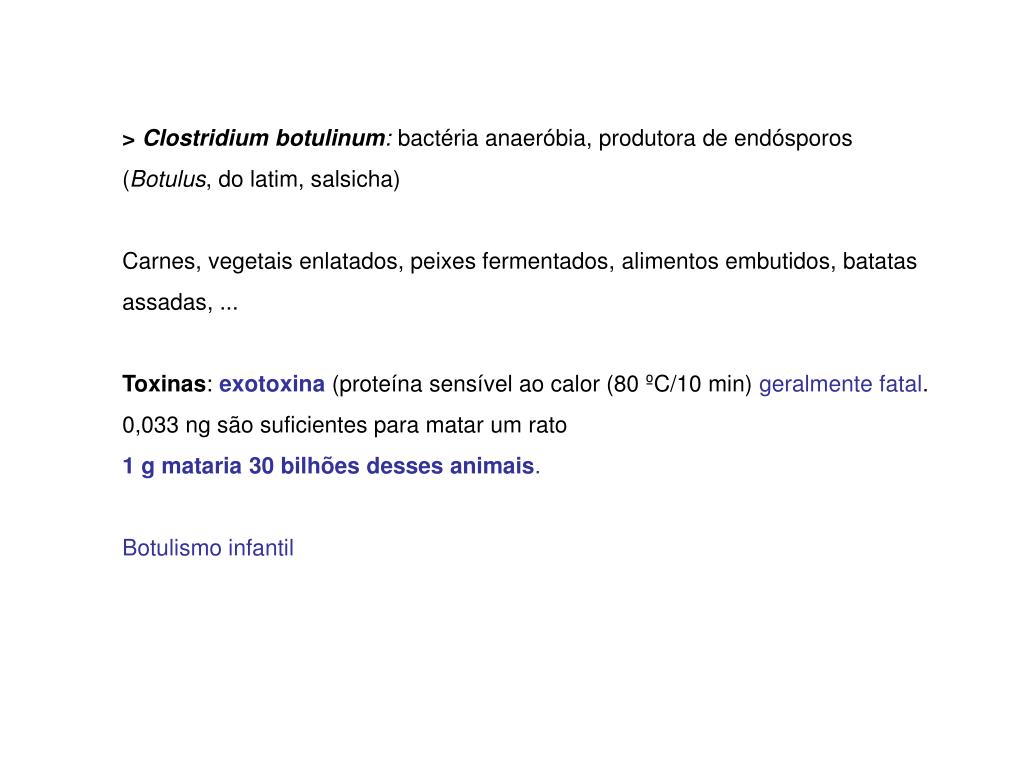 > Clostridium botulinum: bactéria anaeróbia, produtora de endósporos (Botulus, do latim, salsicha) Carnes, vegetais enlatados, peixes fermentados, alimentos embutidos, batatas assadas, ... Toxinas: exotoxina (proteína sensível ao calor (80 ºC/10 min) geralmente fatal. 0,033 ng são suficientes para matar um rato 1 g mataria 30 bilhões desses animais. Botulismo infantil