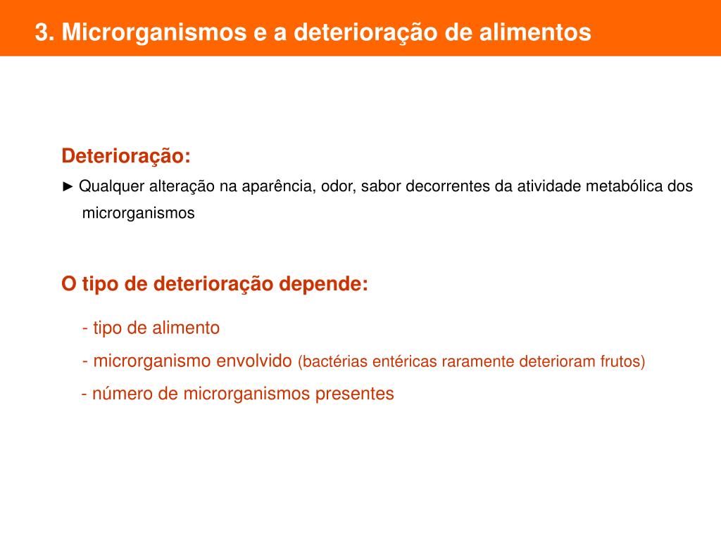 3. Microrganismos e a deterioração de alimentos Deterioração: ► Qualquer alteração na aparência, odor, sabor decorrentes da atividade metabólica dos microrganismos O tipo de deterioração depende: - tipo de alimento - microrganismo envolvido (bactérias entéricas raramente deterioram frutos) - número de microrganismos presentes