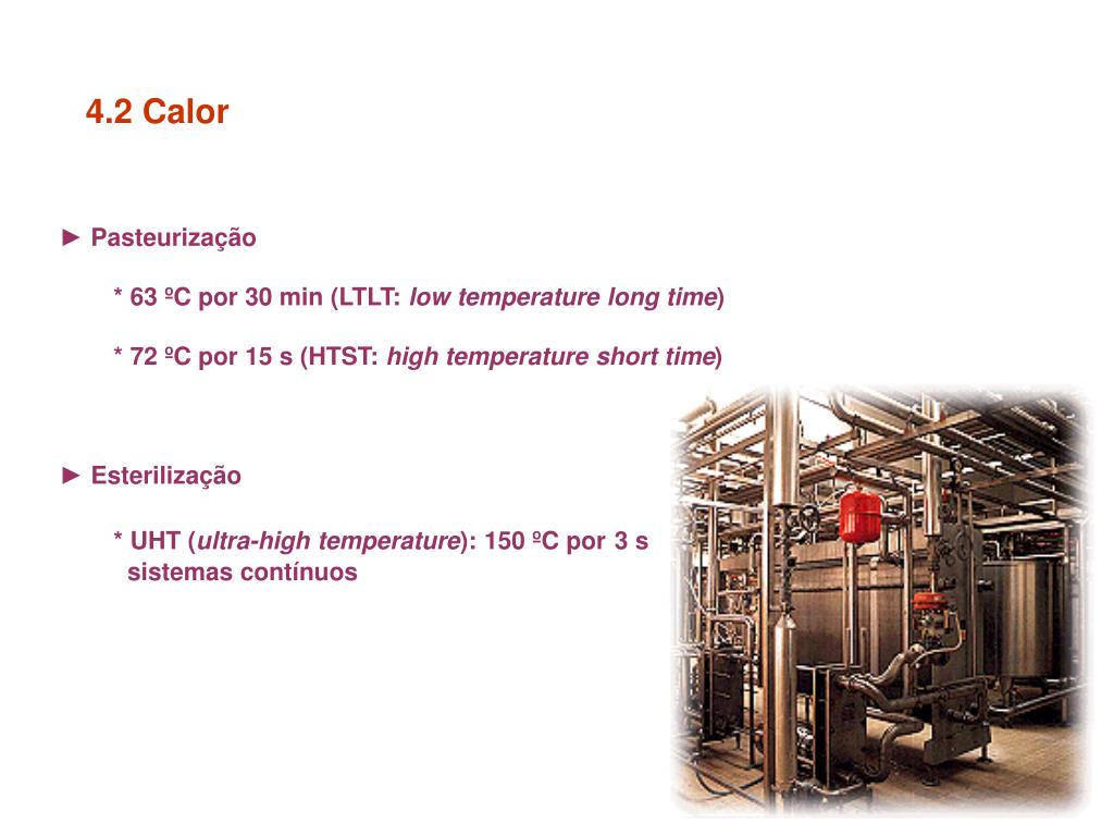 4.2 Calor ► Pasteurização * 63 ºC por 30 min (LTLT: low temperature long time) * 72 ºC por 15 s (HTST: high temperature short time) ► Esterilização * UHT (ultra-high temperature): 150 ºC por3 s sistemas contínuos