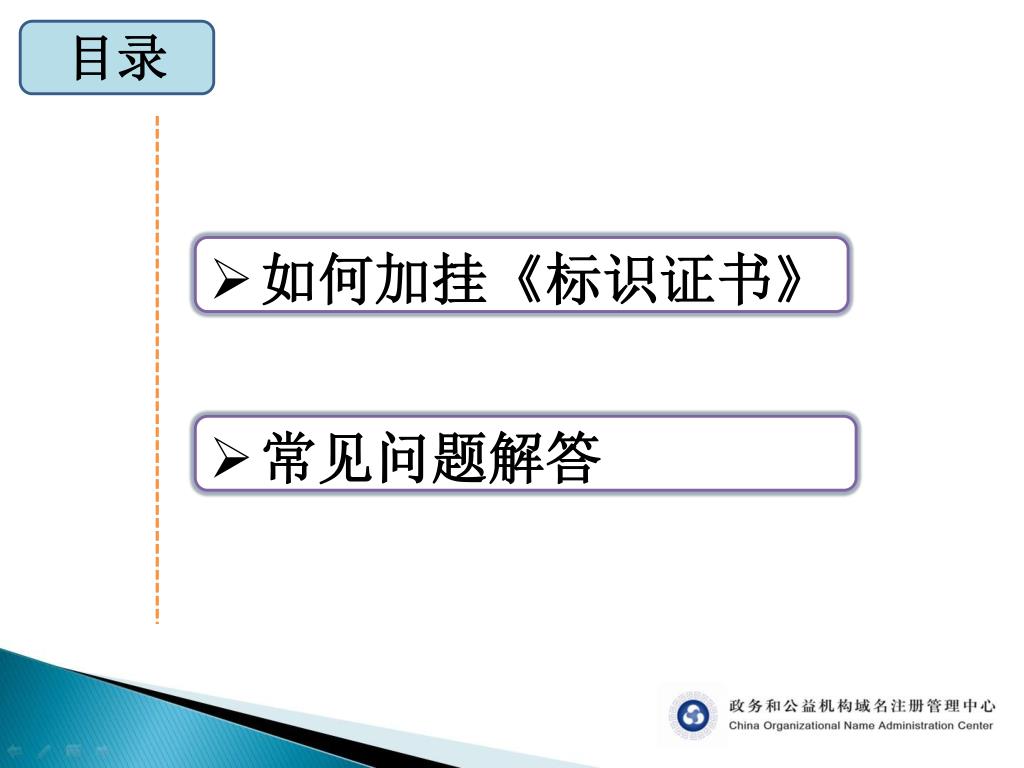 网上名称注册管理系统 问题解答. 政务和公益机构域名注册管理中心 2014 年 5 月. 目录. 如何加挂 《 标识证书 》. 常见问题解答. 网上名称注册系统增加的内容. 完善单位信息,填报网站名称; 生成并加挂 《 标识证书 》 ;. 如何完善单位信息、填报网站名称. 单位简介. 单位职能. 获得代码. 认证标识. 加挂 《 标识证书 》. 自有网站. 无网站. 自有网站. 点击“获得代码”按钮,将系统自动生成的 JS 代码复制并粘贴到网站所有页面的 </body> 前,添加成功后将立即显示图标并可查看其内容 。. 获得代码.
