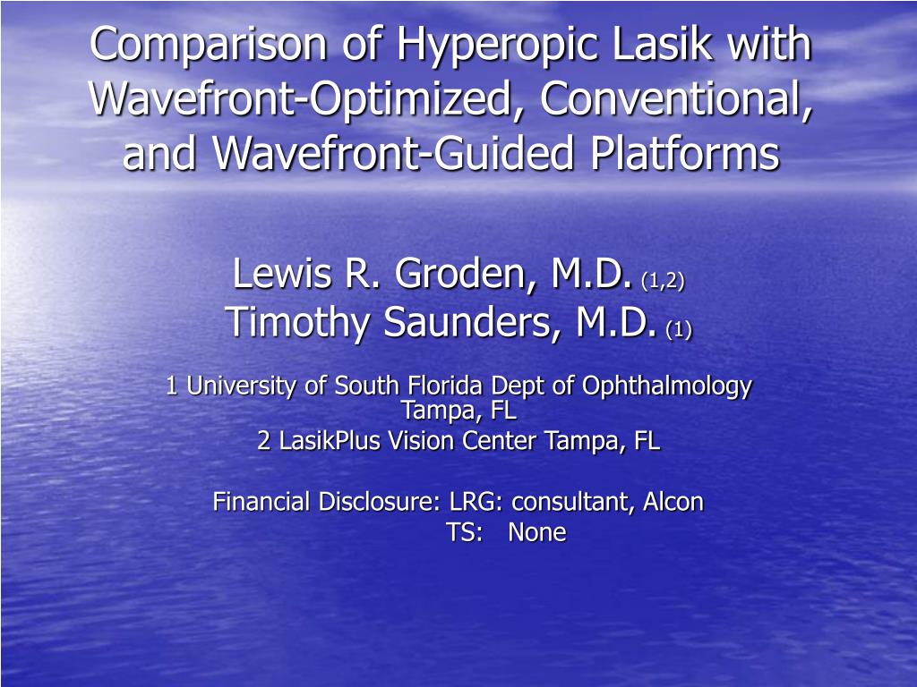 Comparison of Hyperopic Lasik with Wavefront-Optimized, Conventional, and Wavefront-Guided Platforms. Lewis R. Groden, M.D. (1,2) Timothy Saunders, M.D. (1) 1 University of South Florida Dept of Ophthalmology Tampa, FL 2 LasikPlus Vision Center Tampa, FL