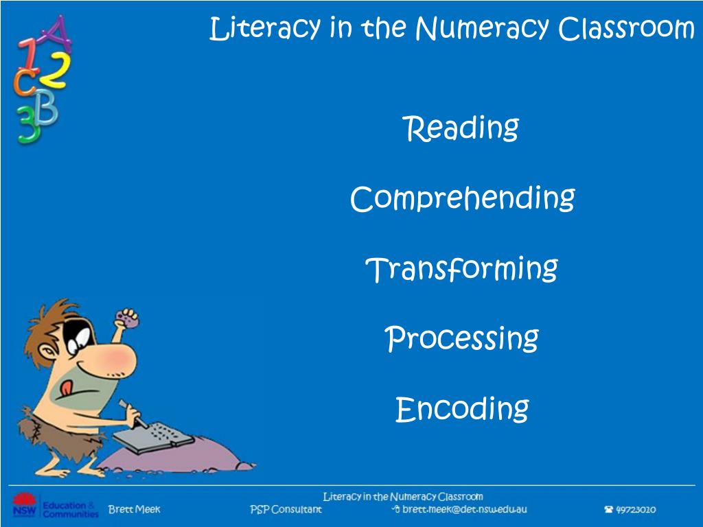 Welcome. Literacy in the Numeracy Classroom . Brett Meek Hunter Central Coast PSP Consultant brett.meek@det.nsw.edu.au 4972 3010. New Scheme Teachers. Literacy in the Numeracy Classroom .