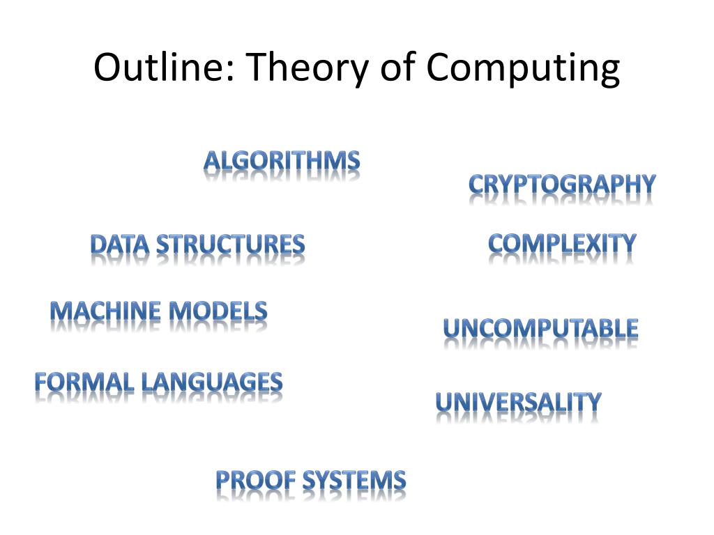 Outline: Theory of Computing Algorithms Cryptography Complexity Data Structures Machine Models Uncomputable Formal Languages Universality Proof Systems