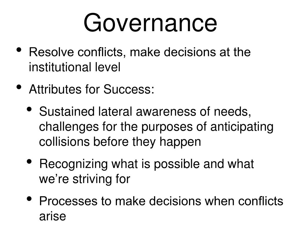 Governance • Resolve conflicts, make decisions at the institutional level • Attributes for Success: • Sustained lateral awareness of needs, challenges for the purposes of anticipating collisions before they happen • Recognizing what is possible and what we’re striving for • Processes to make decisions when conflicts arise