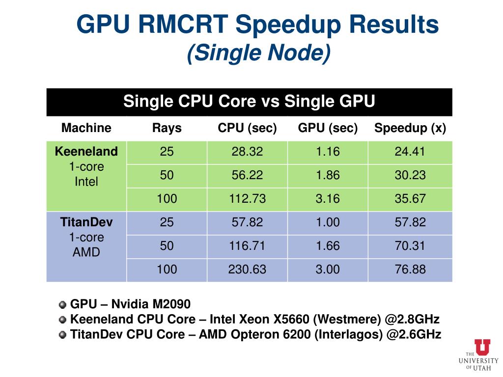 GPU RMCRT Speedup Results(Single Node) GPU – Nvidia M2090 Keeneland CPU Cores – Intel Xeon X5660 (Westmere) @2.8GHz TitanDev CPU Cores – AMD Opteron 6200 (Interlagos) @2.6GHz