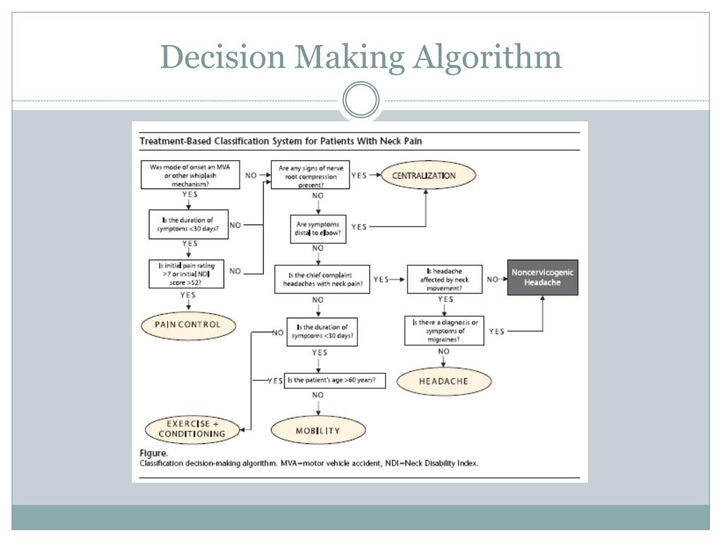Clinical Decision Making Using the patient identified problems, the initial intervention was directed towards the low back and pelvic asymmetry. Secondly, since the patient did not fall completely into any of the clinical prediction rules, cervical mechanical traction was not immediately initiated. Functional goals were set to decrease overall pain, improve mobility of the cervical and lumbar spine, and increase the patients overall function.
