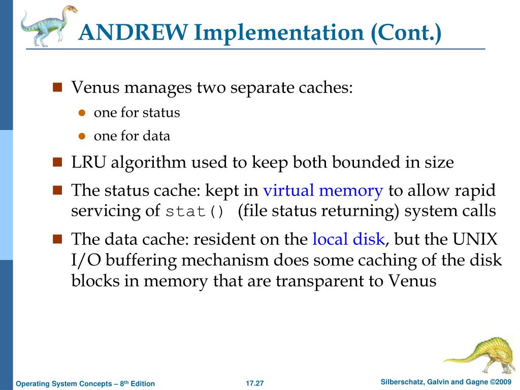 ANDREW Implementation (Cont.) • Venus manages two separate caches: • one for status • one for data • LRU algorithm used to keep both bounded in size • The status cache: kept in virtual memory to allow rapid servicing of stat() (file status returning) system calls • The data cache: resident on the local disk, but the UNIX I/O buffering mechanism does some caching of the disk blocks in memory that are transparent to Venus