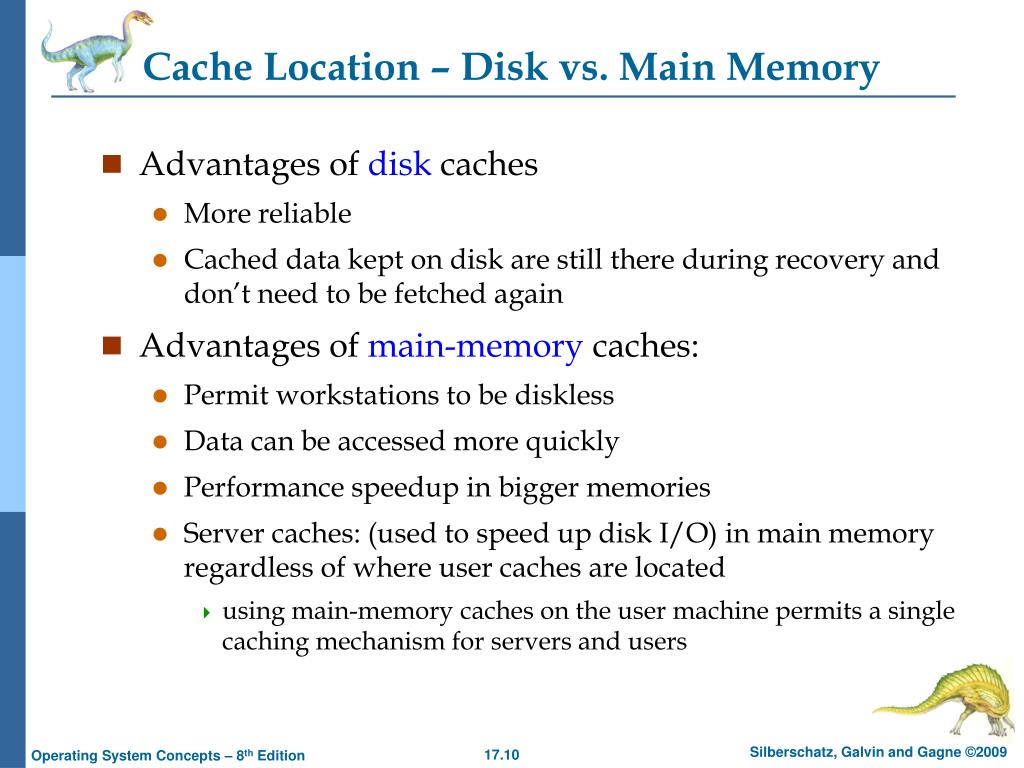 Cache Location – Disk vs. Main Memory • Advantages of disk caches • More reliable • Cached data kept on disk are still there during recovery and don’t need to be fetched again • Advantages of main-memory caches: • Permit workstations to be diskless • Data can be accessed more quickly • Performance speedup in bigger memories • Server caches: (used to speed up disk I/O) in main memory regardless of where user caches are located • using main-memory caches on the user machine permits a single caching mechanism for servers and users