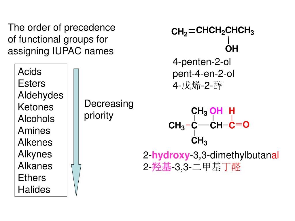 The order of precedence of functional groups for assigning IUPAC names Acids Esters Aldehydes Ketones Alcohols Amines Alkenes Alkynes Alkanes Ethers Halides Decreasing priority 4-penten-2-ol pent-4-en-2-ol 4-戊烯-2-醇 2-hydroxy-3,3-dimethylbutanal 2-羟基-3,3-二甲基丁醛