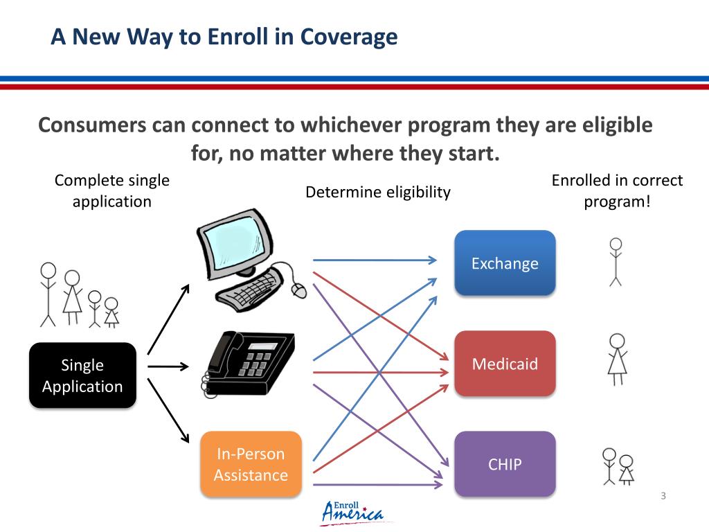 Connecting Millions of Americans with Health Coverage. The 2013-2014 Opportunity. Sampling of Partners . A New Way to Enroll in Coverage. Complete single application. Enrolled in correct program!. Consumers can connect to whichever program they are eligible for, no matter where they start.