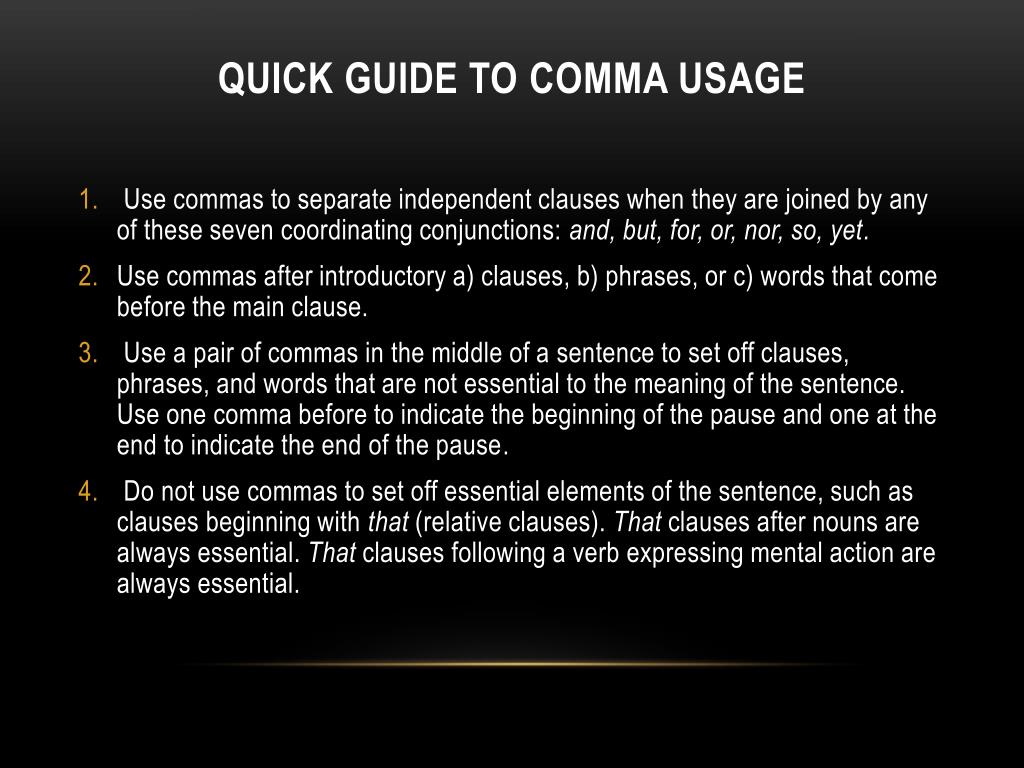 Quick Guide to Comma Usage • Use commas to separate independent clauses when they are joined by any of these seven coordinating conjunctions: and, but, for, or, nor, so, yet. • Use commas after introductory a) clauses, b) phrases, or c) words that come before the main clause. • Use a pair of commas in the middle of a sentence to set off clauses, phrases, and words that are not essential to the meaning of the sentence. Use one comma before to indicate the beginning of the pause and one at the end to indicate the end of the pause. • Do not use commas to set off essential elements of the sentence, such as clauses beginning with that (relative clauses). That clauses after nouns are always essential. That clauses following a verb expressing mental action are always essential.
