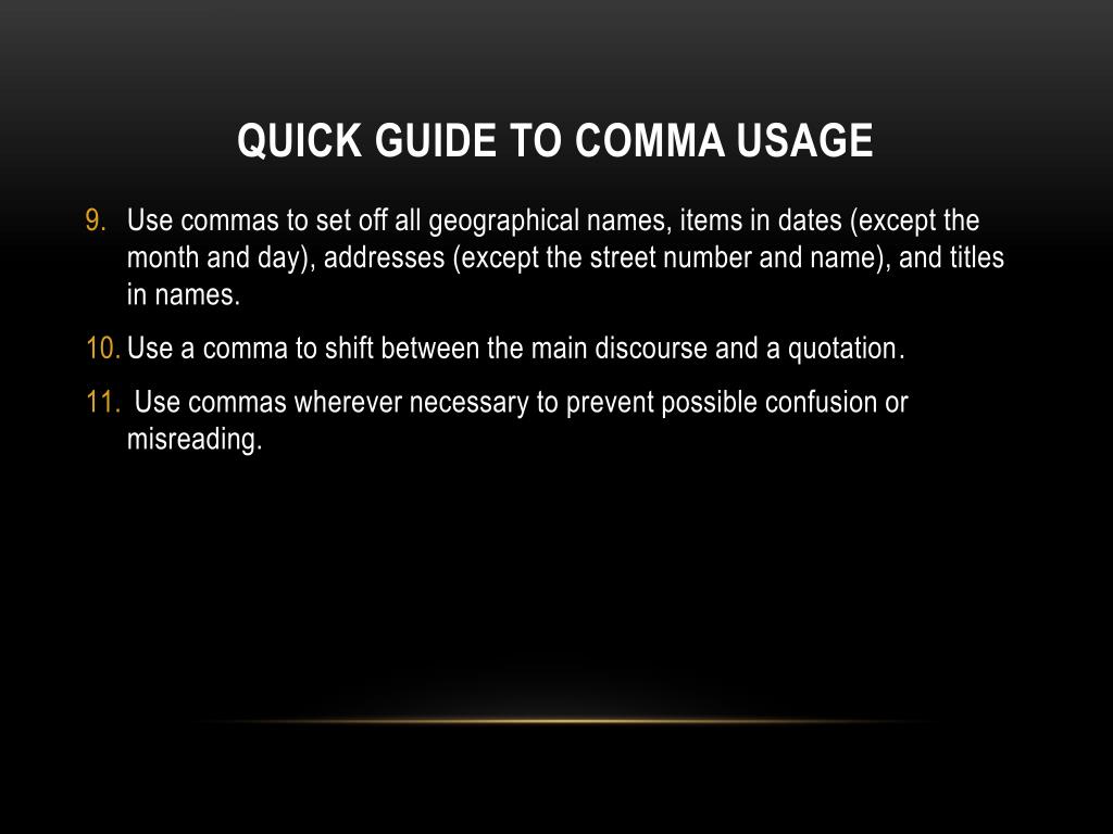 Quick Guide to Comma Usage • Use commas to set off all geographical names, items in dates (except the month and day), addresses (except the street number and name), and titles in names. • Use a comma to shift between the main discourse and a quotation. • Use commas wherever necessary to prevent possible confusion or misreading.