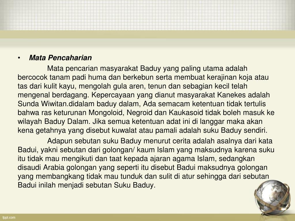 Mata Pencaharian Mata pencarian masyarakat Baduy yang paling utama adalah bercocok tanam padi huma dan berkebun serta membuat kerajinan koja atau tas dari kulit kayu, mengolah gula aren, tenun dan sebagian kecil telah mengenal berdagang. Kepercayaan yang dianut masyarakat Kanekes adalah Sunda Wiwitan.didalam baduy dalam, Ada semacam ketentuan tidak tertulis bahwa ras keturunan Mongoloid, Negroid dan Kaukasoid tidak boleh masuk ke wilayah Baduy Dalam. Jika semua ketentuan adat ini di langgar maka akan kena getahnya yang disebut kuwalat atau pamali adalah suku Baduy sendiri. Adapun sebutan suku Baduy menurut cerita adalah asalnya dari kata Badui, yakni sebutan dari golongan/ kaum Islam yang maksudnya karena suku itu tidak mau mengikuti dan taat kepada ajaran agama Islam, sedangkan disaudi Arabia golongan yang seperti itu disebut Badui maksudnya golongan yang membangkang tidak mau tunduk dan sulit di atur sehingga dari sebutan Badui inilah menjadi sebutan Suku Baduy.