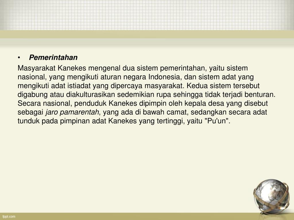 7 Unsur Budaya • Bahasa Bahasa yang mereka gunakan adalah Bahasa Sunda dialek Sunda–Banten. Untuk berkomunikasi dengan penduduk luar mereka lancar menggunakan Bahasa Indonesia, walaupun mereka tidak mendapatkan pengetahuan tersebut dari sekolah. Orang Kanekes Dalam tidak mengenal budaya tulis, sehingga adat-istiadat, kepercayaan/agama, dan cerita nenek moyang hanya tersimpan di dalam tuturan lisan saja. • Kepercayaan Kepercayaan masyarakat Kanekes yang disebut sebagai Sunda Wiwitan berakar pada pemujaan kepada arwah nenek moyang (Animisme) yang pada perkembangan selanjutnya juga dipengaruhi oleh Agama Buddha, Hindu, . Inti kepercayaan tersebut ditunjukkan dengan adanya pikukuh atau ketentuan adat mutlak yang dianut dalam kehidupan sehari-hari orang Kanekes. Isi terpenting dari 'pikukuh' (kepatuhan) Kanekes tersebut adalah konsep "tanpa perubahan apa pun", atau perubahan sesedikit mungkin. Lojor heunteu beunang dipotong, pèndèk heunteu beunang disambung. (Panjang tidak bisa/tidak boleh dipotong, pendek tidak bisa/tidak boleh disambung)