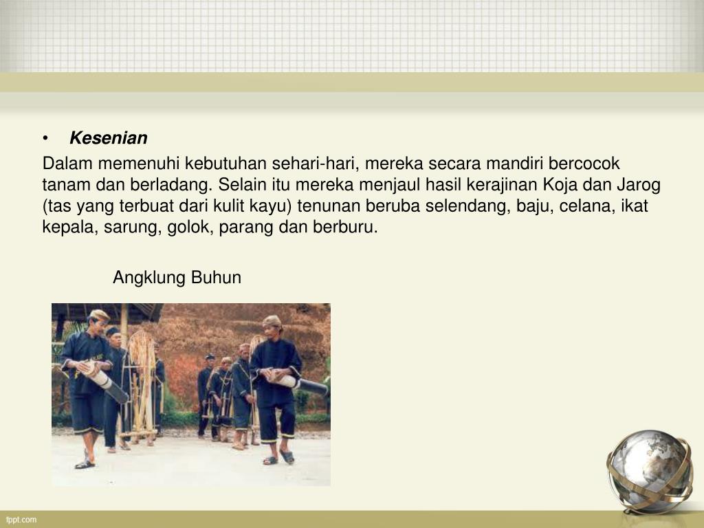 Kesenian Dalam memenuhi kebutuhan sehari-hari, mereka secara mandiri bercocok tanam dan berladang. Selain itu mereka menjaul hasil kerajinan Koja dan Jarog (tas yang terbuat dari kulit kayu) tenunan beruba selendang, baju, celana, ikat kepala, sarung, golok, parang dan berburu. Angklung Buhun