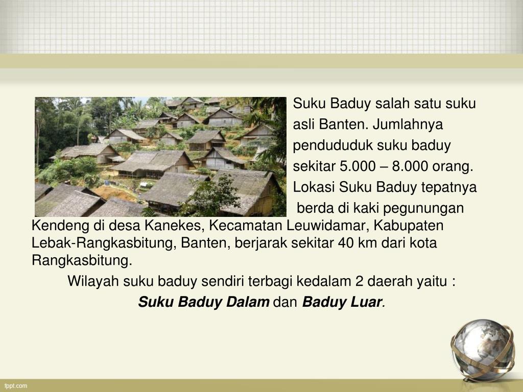 Suku Baduy salah satu suku asli Banten. Jumlahnya pendududuk suku baduy sekitar 5.000 – 8.000 orang. Lokasi Suku Baduy tepatnya berda di kaki pegunungan Kendeng di desa Kanekes, Kecamatan Leuwidamar, Kabupaten Lebak-Rangkasbitung, Banten, berjarak sekitar 40 km dari kota Rangkasbitung. Wilayah suku baduy sendiri terbagi kedalam 2 daerah yaitu : Suku Baduy Dalam dan Baduy Luar.