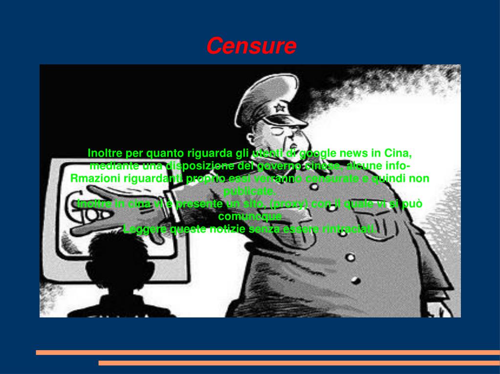 Censure Inoltre per quanto riguarda gli utenti di google news in Cina, mediante una disposizione del governo cinese, alcune info- Rmazioni riguardanti proprio essi verranno censurate e quindi non publicate. Inoltre in cina vi è presente un sito, (proxy) con il quale vi si può comuncque Leggere queste notizie senza essere rintraciati.