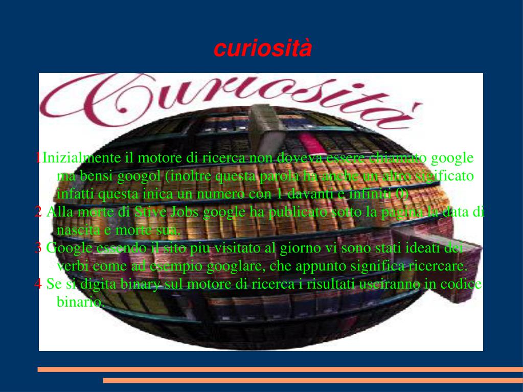 curiosità 1Inizialmente il motore di ricerca non doveva essere chiamato google ma bensi googol (inoltre questa parola ha anche un altro sigificato infatti questa inica un numero con 1 davanti e infiniti 0) 2Alla morte di Stive Jobs google ha publicato sotto la pagina la data di nascita e morte sua. 3 Google essendo il sito piu visitato al giorno vi sono stati ideati dei verbi come ad esempio googlare, che appunto significa ricercare. 4 Se si digita binary sul motore di ricerca i risultati usciranno in codice binario.