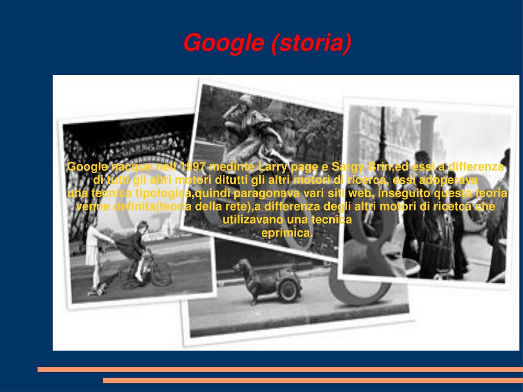 Google (storia) Google nacque nell 1997 medinte Larry page e Sargy Brin,ed essi a differenza di tutti gli altri motori ditutti gli altri motori di ricerca, essi adoperava una tecnica tipologica,quindi paragonava vari siti web, inseguito questa teoria venne definita(teoria della rete),a differenza degli altri motori di ricetca che utilizavano una tecnica eprimica.