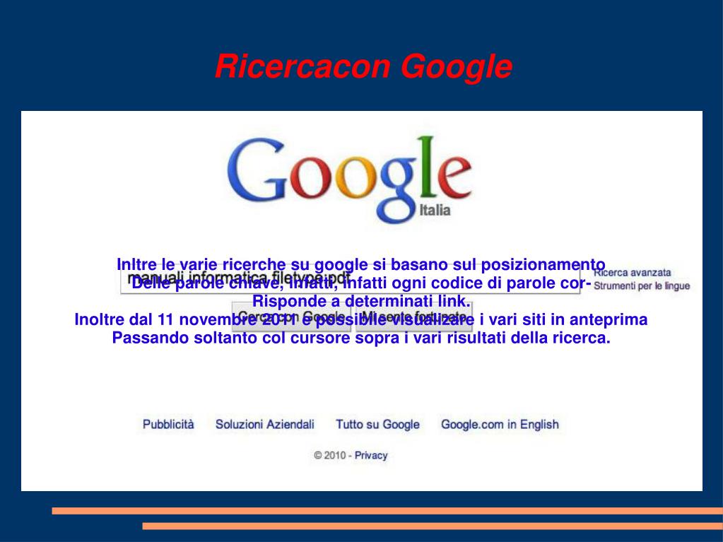 Ricercacon Google Inltre le varie ricerche su google si basano sul posizionamento Delle parole chiave, infatti, infatti ogni codice di parole cor- Risponde a determinati link. Inoltre dal 11 novembre 2011 e possibile visualizare i vari siti in anteprima Passando soltanto col cursore sopra i vari risultati della ricerca.
