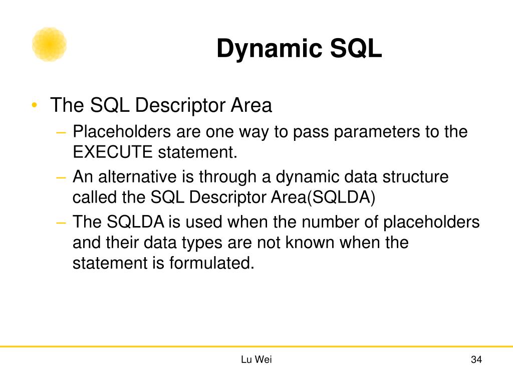 Dynamic SQL • The SQL Descriptor Area • Placeholders are one way to pass parameters to the EXECUTE statement. • An alternative is through a dynamic data structure called the SQL Descriptor Area(SQLDA) • The SQLDA is used when the number of placeholders and their data types are not known when the statement is formulated. Lu Wei