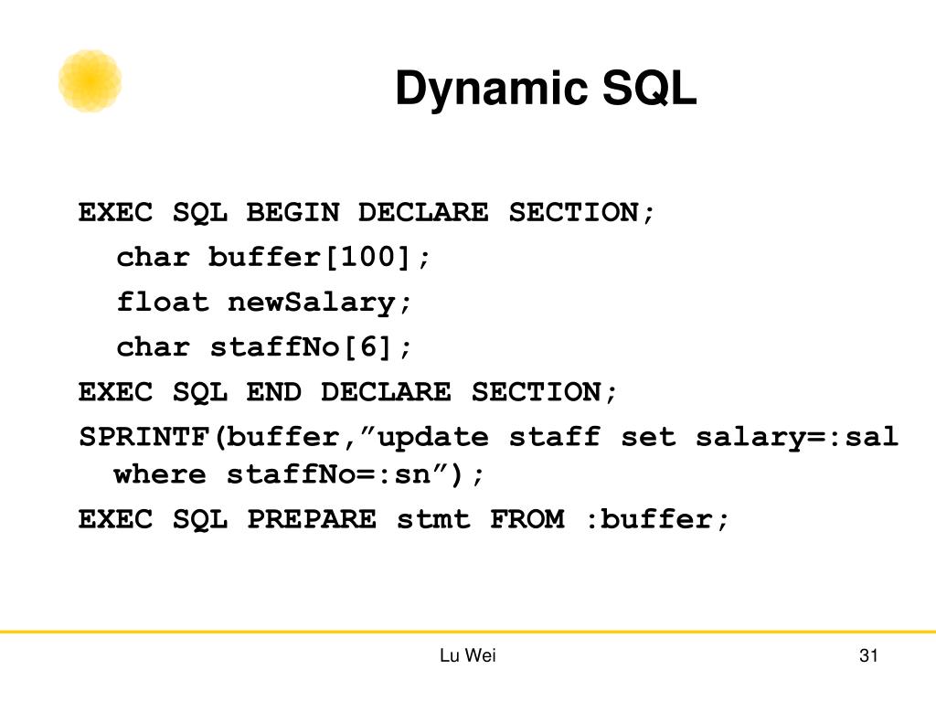 Dynamic SQL EXEC SQL BEGIN DECLARE SECTION; char buffer[100]; float newSalary; char staffNo[6]; EXEC SQL END DECLARE SECTION; SPRINTF(buffer,”update staff set salary=:sal where staffNo=:sn”); EXEC SQL PREPARE stmt FROM :buffer; Lu Wei