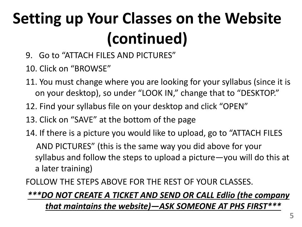 Setting up Your Classes on the Website (continued) 9. Go to “ATTACH FILES AND PICTURES” 10. Click on “BROWSE” 11. You must change where you are looking for your syllabus (since it is on your desktop), so under “LOOK IN,” change that to “DESKTOP.” 12. Find your syllabus file on your desktop and click “OPEN” 13. Click on “SAVE” at the bottom of the page 14. If there is a picture you would like to upload, go to “ATTACH FILES AND PICTURES” (this is the same way you did above for your syllabus and follow the steps to upload a picture—you will do this at a later training) FOLLOW THE STEPS ABOVE FOR THE REST OF YOUR CLASSES. ***DO NOT CREATE A TICKET AND SEND OR CALL Edlio (the company that maintains the website)—ASK SOMEONE AT PHS FIRST***
