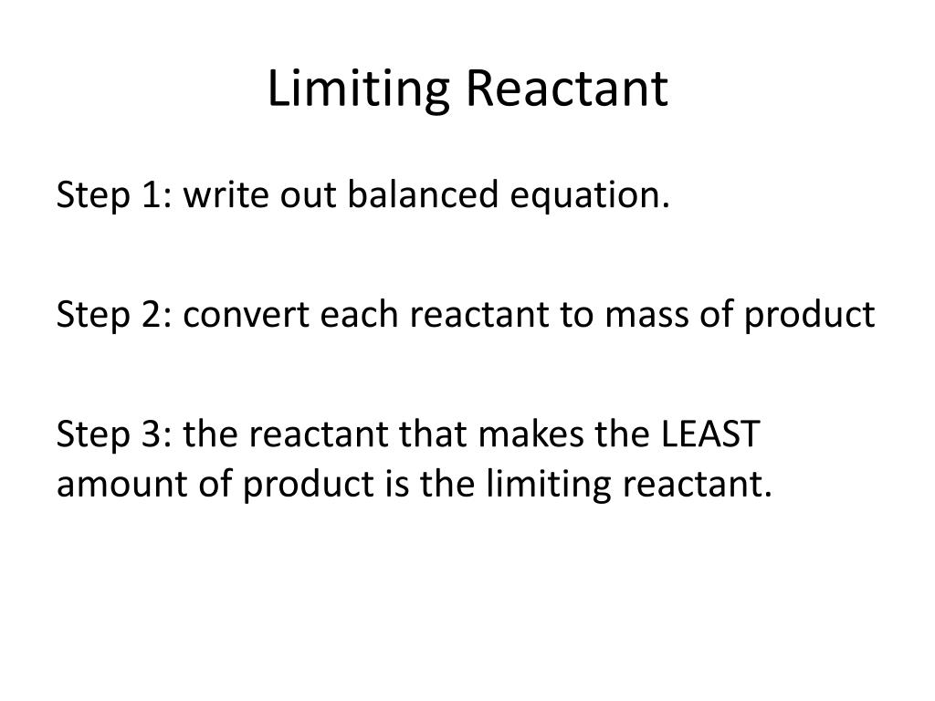 Limiting Reactant Step 1: write out balanced equation. Step 2: convert each reactant to mass of product Step 3: the reactant that makes the LEAST amount of product is the limiting reactant.