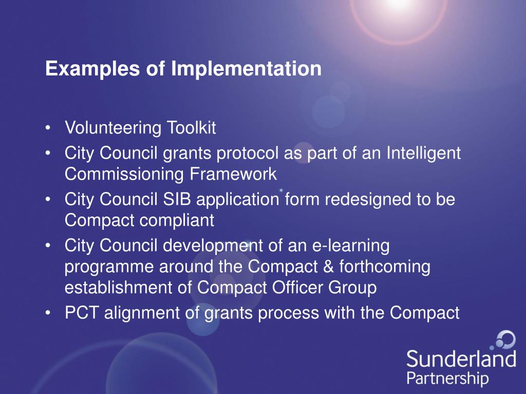 Examples of Implementation • Volunteering Toolkit • City Council grants protocol as part of an Intelligent Commissioning Framework • City Council SIB application form redesigned to be Compact compliant • City Council development of an e-learning programme around the Compact & forthcoming establishment of Compact Officer Group • PCT alignment of grants process with the Compact