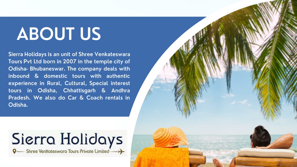ABOUT US Sierra Holidays is an unit of Shree Venkateswara Tours Pvt Ltd born in 2007 in the temple city of Odisha- Bhubaneswar. The company deals with inbound & domestic tours with authentic experience in Rural, Cultural, Special interest tours in Odisha, Chhattisgarh & Andhra Pradesh. We also do Car & Coach rentals in Odisha.