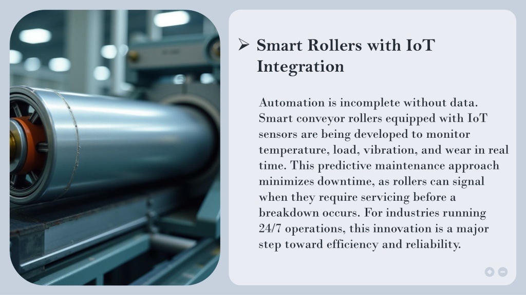 ➢ Smart Rollers with IoT Integration Automation is incomplete without data. Smart conveyor rollers equipped with IoT sensors are being developed to monitor temperature, load, vibration, and wear in real time. This predictive maintenance approach minimizes downtime, as rollers can signal when they require servicing before a breakdown occurs. For industries running 24/7 operations, this innovation is a major step toward efficiency and reliability.