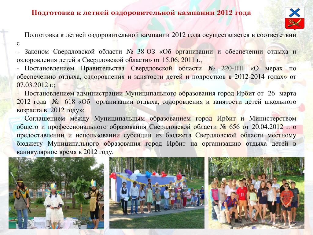 Подготовка к летней оздоровительной кампании 2012 года • Подготовка к летней оздоровительной кампании 2012 года осуществляется в соответствии с • Законом Свердловской области № 38-ОЗ «Об организации и обеспечении отдыха и оздоровления детей в Свердловской области» от 15.06. 2011 г., • Постановлением Правительства Свердловской области № 220-ПП «О мерах по обеспечению отдыха, оздоровления и занятости детей и подростков в 2012-2014 годах» от 07.03.2012 г.; • Постановлением администрации Муниципального образования город Ирбит от 26 марта 2012 года № 618 «Об организации отдыха, оздоровления и занятости детей школьного возраста в 2012 году»; • Соглашением между Муниципальным образованием город Ирбит и Министерством общего и профессионального образования Свердловской области № 656 от 20.04.2012 г. о предоставлении и использовании субсидии из бюджета Свердловской области местному бюджету Муниципального образования город Ирбит на организацию отдыха детей в каникулярное время в 2012 году.