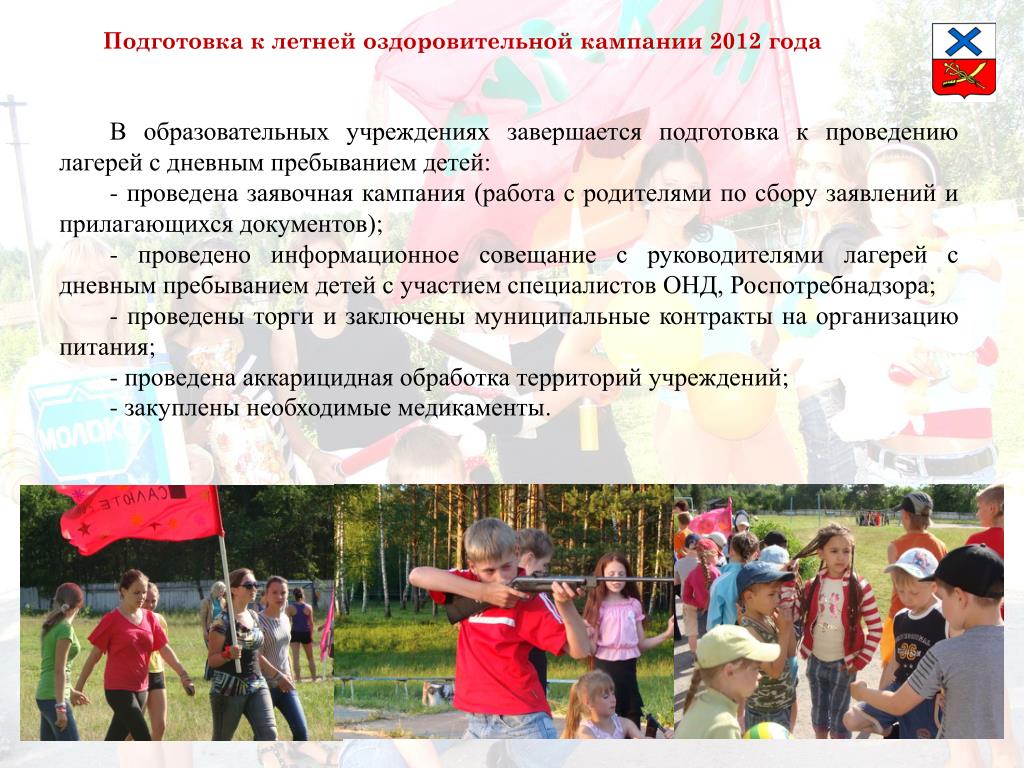 Подготовка к летней оздоровительной кампании 2012 года В образовательных учреждениях завершается подготовка к проведению лагерей с дневным пребыванием детей: - проведена заявочная кампания (работа с родителями по сбору заявлений и прилагающихся документов); - проведено информационное совещание с руководителями лагерей с дневным пребыванием детей с участием специалистов ОНД, Роспотребнадзора; - проведены торги и заключены муниципальные контракты на организацию питания; - проведена аккарицидная обработка территорий учреждений; - закуплены необходимые медикаменты.