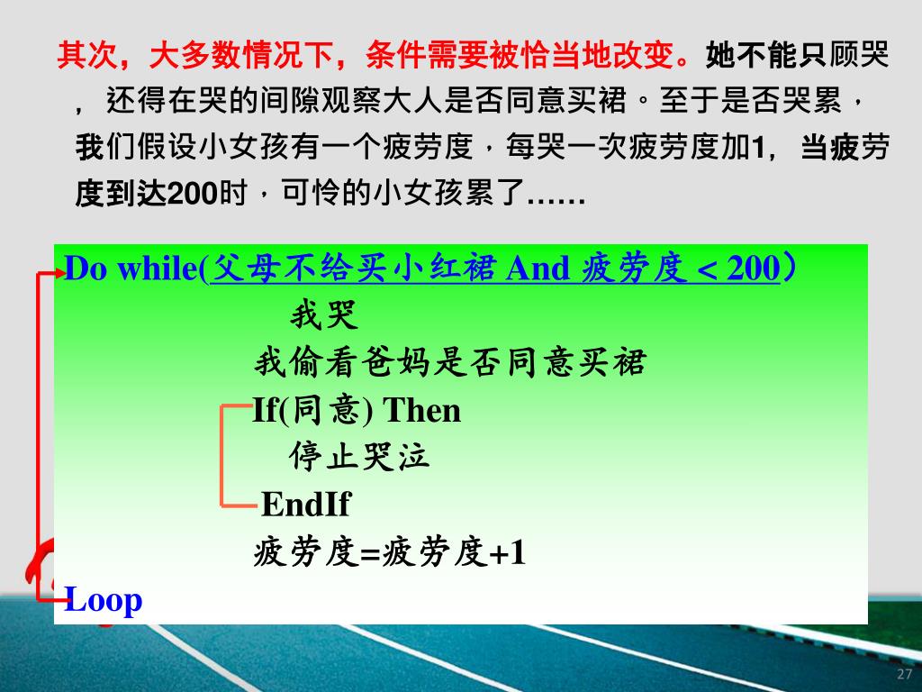 其次,大多数情况下,条件需要被恰当地改变。她不能只顾哭,还得在哭的间隙观察大人是否同意买裙。至于是否哭累,我们假设小女孩有一个疲劳度,每哭一次疲劳度加1,当疲劳度到达200时,可怜的小女孩累了…… Do while(父母不给买小红裙 And 疲劳度 < 200) 我哭 我偷看爸妈是否同意买裙 If(同意) Then 停止哭泣 EndIf 疲劳度=疲劳度+1 Loop