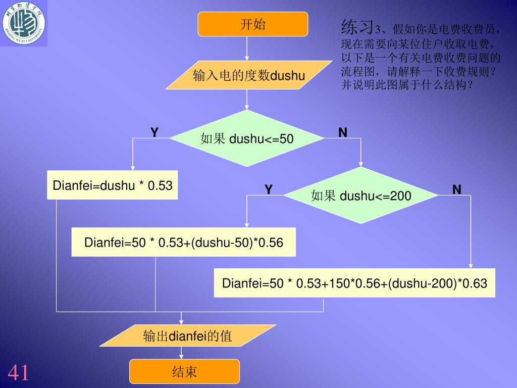 输入电的度数dushu 如果 dushu<=50 Y Y N 如果 dushu<=200 Dianfei=dushu * 0.53 N Dianfei=50 * 0.53+(dushu-50)*0.56 Dianfei=50 * 0.53+150*0.56+(dushu-200)*0.63 输出dianfei的值 结束 开始 练习3、假如你是电费收费员,现在需要向某位住户收取电费,以下是一个有关电费收费问题的流程图,请解释一下收费规则?并说明此图属于什么结构?