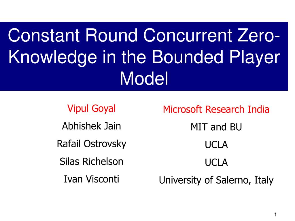 Constant Round Concurrent Zero-Knowledge in the Bounded Player Model Vipul Goyal Abhishek Jain Rafail Ostrovsky Silas Richelson Ivan Visconti Microsoft Research India MIT and BU UCLA UCLA University of Salerno, Italy