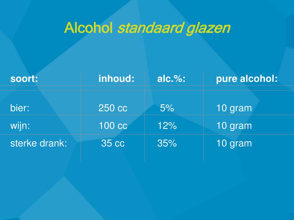 Alcohol standaard glazen soort: inhoud:alc.%:pure alcohol: bier: 250 cc 5% 10 gram wijn: 100 cc 12% 10 gram sterke drank: 35 cc 35% 10 gram