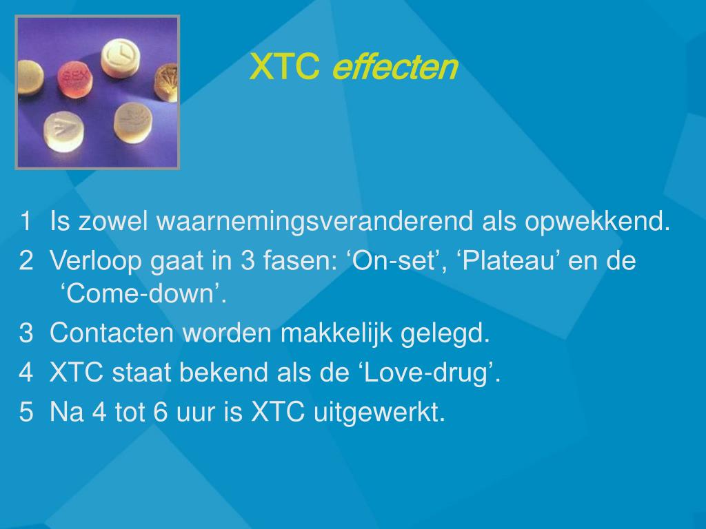 1 Is zowel waarnemingsveranderend als opwekkend. 2 Verloop gaat in 3 fasen: ‘On-set’, ‘Plateau’ en de ‘Come-down’. 3 Contacten worden makkelijk gelegd. 4 XTC staat bekend als de ‘Love-drug’. 5 Na 4 tot 6 uur is XTC uitgewerkt. XTC effecten