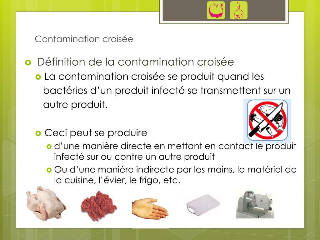 Définition de la contamination croisée La contamination croisée se produit quand les bactéries d’un produit infecté se transmettent sur un autre produit. Ceci peut se produire d’une manière directe en mettant en contact le produit infecté sur ou contre un autre produit Ou d’une manière indirecte par les mains, le matériel de la cuisine, l’évier, le frigo, etc. Contamination croisée
