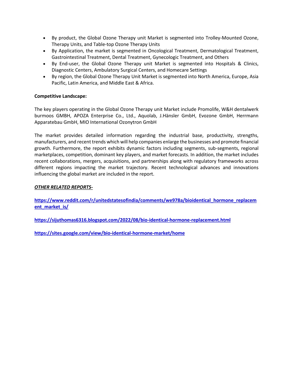 By product, the Global Ozone Therapy unit Market is segmented into Trolley-Mounted Ozone, Therapy Units, and Table-top Ozone Therapy Units By Application, the market is segmented in Oncological Treatment, Dermatological Treatment, Gastrointestinal Treatment, Dental Treatment, Gynecologic Treatment, and Others By End-user, the Global Ozone Therapy unit Market is segmented into Hospitals & Clinics, Diagnostic Centers, Ambulatory Surgical Centers, and Homecare Settings By region, the Global Ozone Therapy Unit Market is segmented into North America, Europe, Asia Pacific, Latin America, and Middle East & Africa. Competitive Landscape: The key players operating in the Global Ozone Therapy unit Market include Promolife, W&H dentalwerk burmoos GMBH, APOZA Enterprise Co., Ltd., Aquolab, J.Hänsler GmbH, Evozone GmbH, Herrmann Apparatebau GmbH, MIO International Ozonytron GmbH The market provides detailed information regarding the industrial base, productivity, strengths, manufacturers, and recent trends which will help companies enlarge the businesses and promote financial growth. Furthermore, the report exhibits dynamic factors including segments, sub-segments, regional marketplaces, competition, dominant key players, and market forecasts. In addition, the market includes recent collaborations, mergers, acquisitions, and partnerships along with regulatory frameworks across different regions impacting the market trajectory. Recent technological advances and innovations influencing the global market are included in the report. OTHER RELATED REPORTS- https://www.reddit.com/r/unitedstatesofindia/comments/we978a/bioidentical_hormone_replacem ent_market_is/ https://sijuthomas6316.blogspot.com/2022/08/bio-identical-hormone-replacement.html https://sites.google.com/view/bio-identical-hormone-market/home