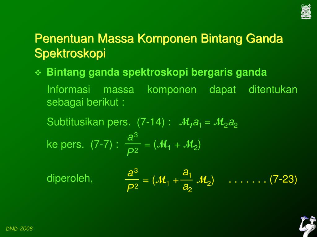 a3 =(M1+M2) P2 a3 =(M1+ M2) a1 P2 a2 Penentuan Massa Komponen Bintang Ganda Spektroskopi • Bintang ganda spektroskopi bergaris ganda Informasi massa komponen dapat ditentukan sebagai berikut : Subtitusikan pers. (7-14) : M1a1 = M2a2 ke pers. (7-7) : diperoleh, . . . . . . . (7-23)